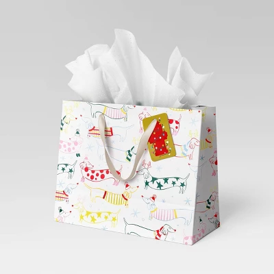 Add canine charm to your seasonal gifting with this Christmas Humble Cheer Large Dachshund Sweater Gift Bag from Wondershop™. This paper gift bag features allover print of dachshunds wearing sweaters for a cute and whimsical look. The large size makes it great for handing out gifts, goodies and more, and it has white ribbon handles for easy carrying.