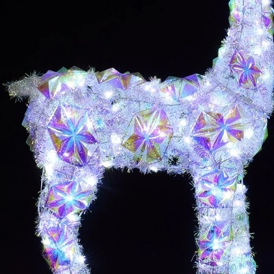 Elevate your outdoor Christmas décor with this stunning 3-piece multicolor snowflake deer holiday light set. These enchanting deer are beautifully adorned with high-refractive octagonal snowflake panels that cast dazzling rainbow hues of pink, purple, blue, and yellow when illuminated. Enhanced with shimmering silver iridescent tinsel, this display sparkles brilliantly in the daylight and radiates even more magic at night, featuring an impressive 340 cool white LED lights. The set includes three majestic deer in varying heights (46.46″, 34.65″, and 23.23″), along with 12 sturdy metal ground stakes for secure outdoor installation. With its plug-in design, setup is a breeze, making it the perfect addition to front porches, lawns, commercial spaces, and beyond. Transform your holiday display into a mesmerizing winter wonderland!